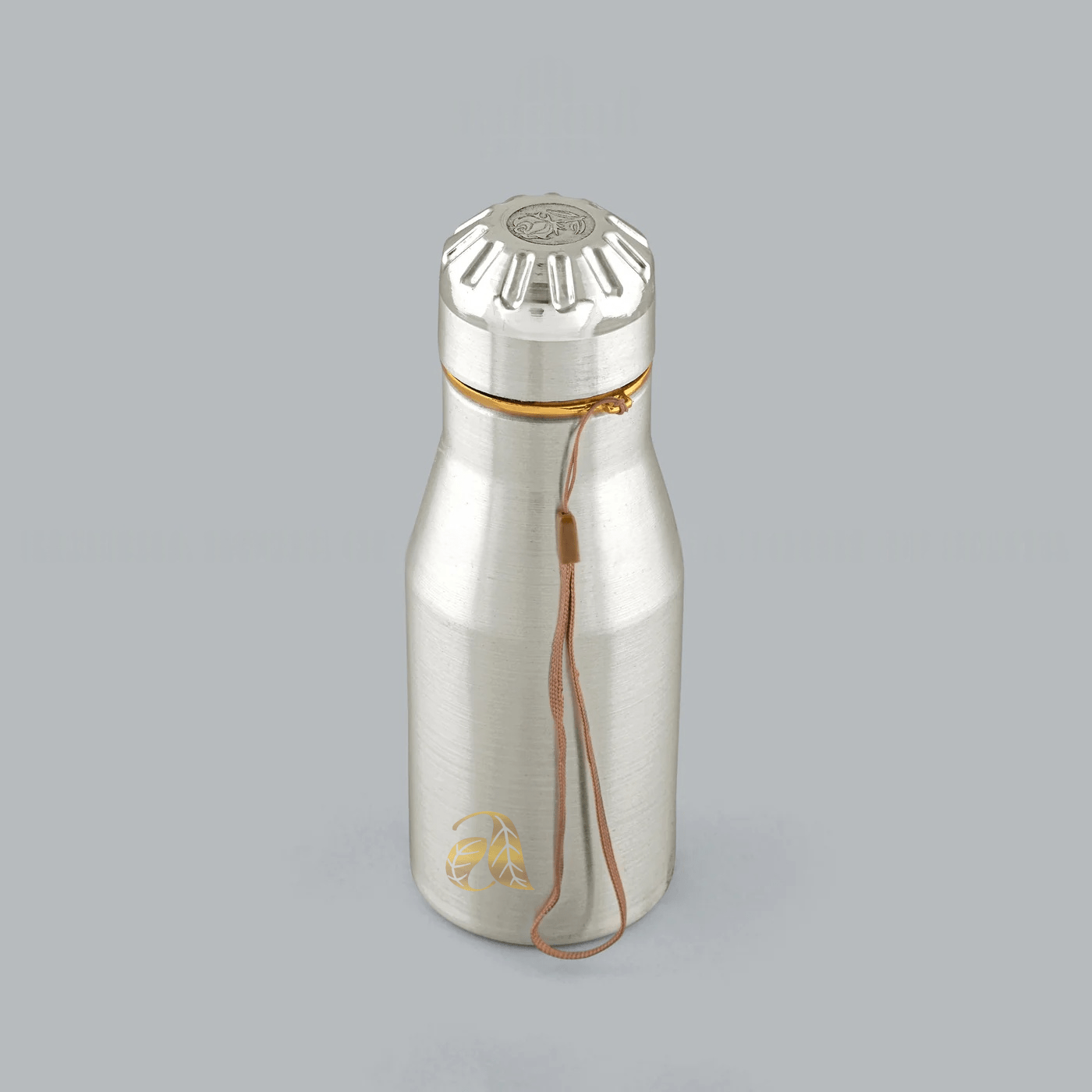 A sleek silver bottle, epitome of elegance and functionality. Crafted IN 925 pure silver, it exudes modern charm. Perfect for storing water on the go.