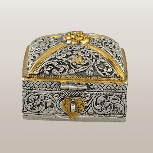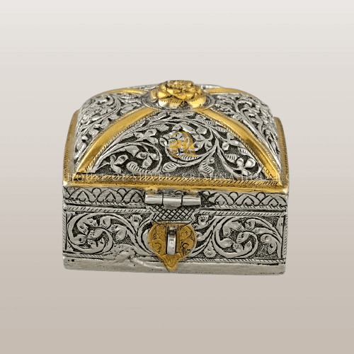 Exuding timeless charm, this antique silver piece is a masterpiece in 925 pure silver. Adorned with intricate floral designs and delicate gold-polished accents along its edges and tops, it’s a stunning blend of tradition and luxury, a true collector’s treasure.