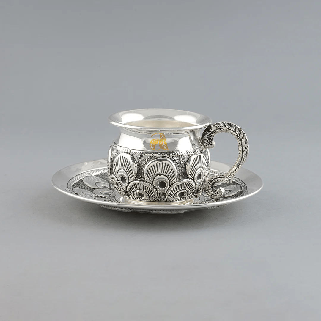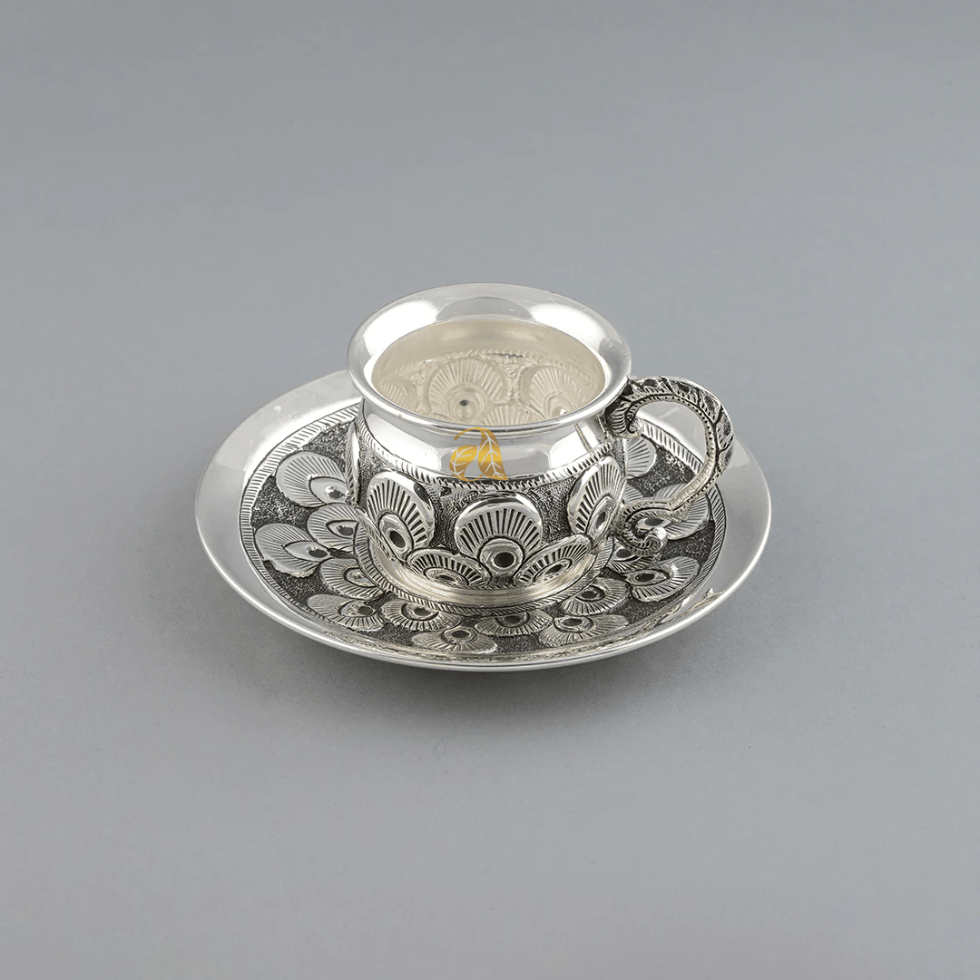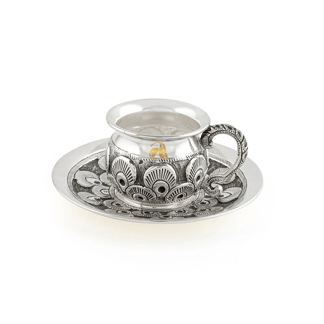 Silver Antique Tea Cup and Saucer with Peacock Feathers