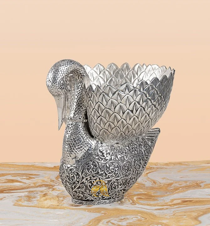 Premium Swan Silver Basket crafted in high-quality silver, featuring elegant swan design and intricate detailing. Ideal for bulk orders, gifting, or home décor collections, this showpiece adds a touch of sophistication to any space. Perfect for retailers and wholesalers looking for luxury silver decorative items.